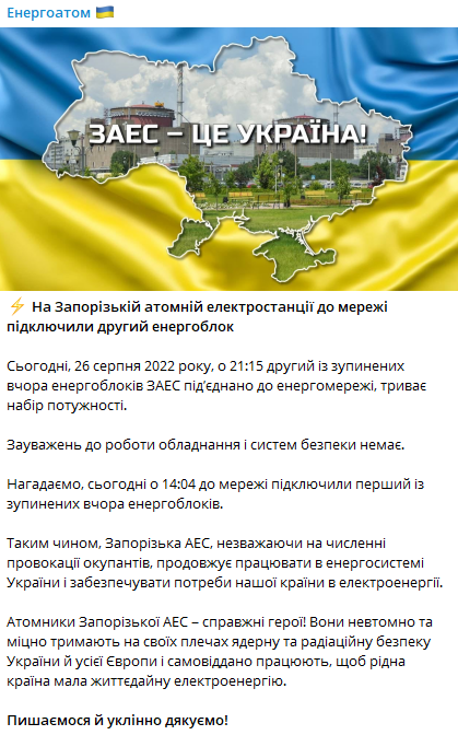"Сегодня, 26 августа 2022 года, в 21:15 второй из остановленных вчера энергоблоков ЗАЭС подключен к сети, продолжается набор мощности. Замечаний к работе оборудования и систем безопасности нет", – говорится в сообщении.