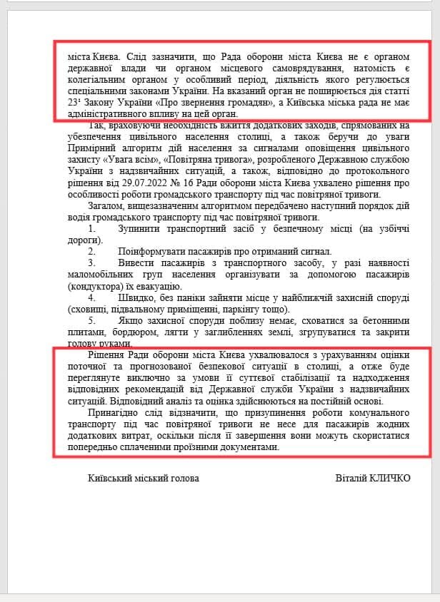 В ответе говорится, что решение останавливать транспорт принял Совет обороны города, который не является органом государственной власти или местного самоуправления, а "коллегиальным органом в особый период, деятельность которого регулируется специальными законами".