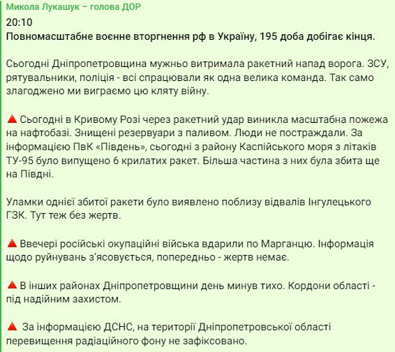 Об этом сообщил глава Днепропетровского облсовета Николай Лукашук в своем Телеграм-канале.