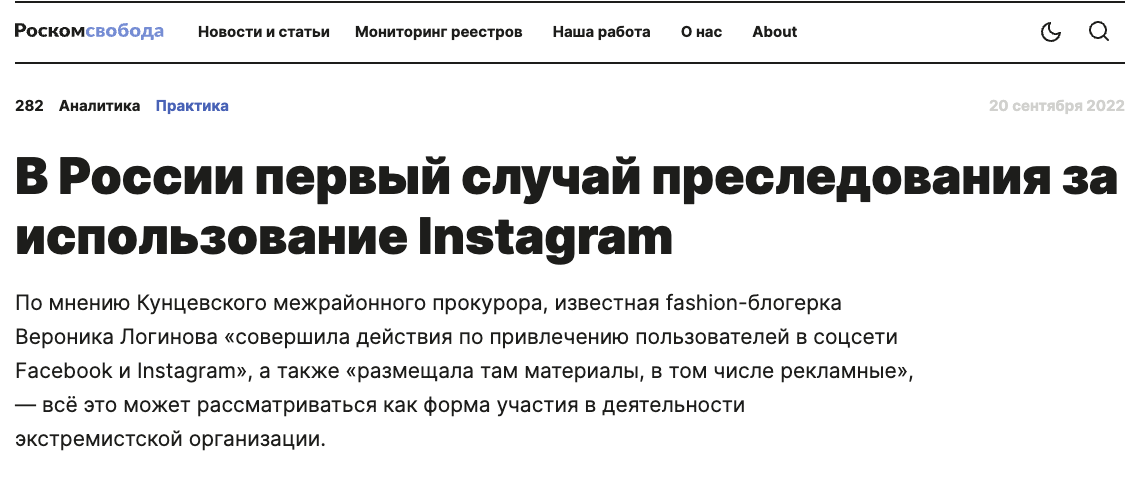 В России завели первое уголовное дело за использование Instagram, запрещенного в РФ в первые месяца вторжения. 18-летней бьюти-блогерше Веронике Логиновой грозит шесть лет тюрьмы по обвинению в участии в деятельности экстремистской организации.