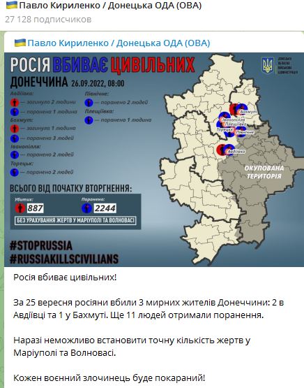 За минувшие сутки, 25 сентября, от действий военных РФ в Донецкой области погибли три мирных жителя.