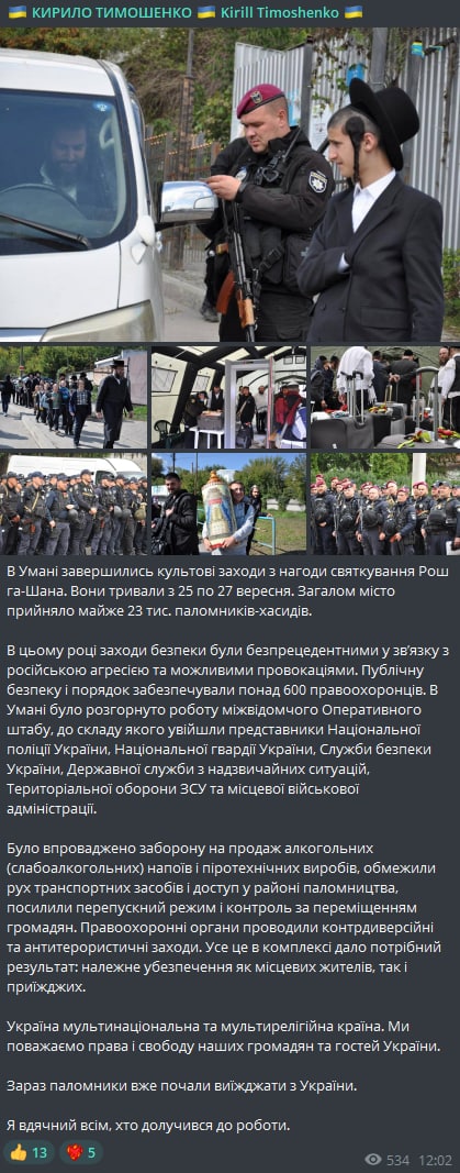 Завершилось празднование Рош-ха-Шана, собирающее ежегодно в Умани тысячи паломников-хасидов со всего мира. Празднования продолжались с 25 по 27 сентября, в них приняли участие 23 тысячи человек, заявил замглавы ОП Кирилл Тимошенко.