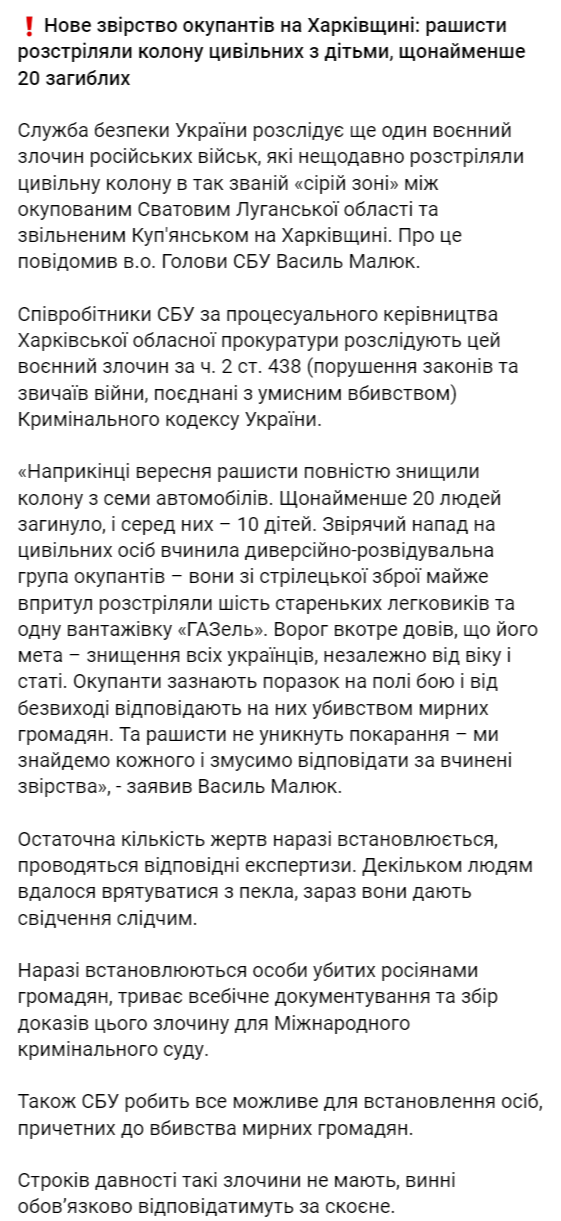 По словам Малюка, сотрудники СБУ под процессуальным руководством Харьковской областной прокуратуры расследуют это военное преступление по ч. 2 ст. 438 (нарушения законов и обычаев войны, соединенные с умышленным убийством) Уголовного кодекса Украины.