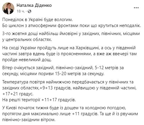 Синоптик Наталья Диденко пишет, что понедельник в Украине будет влажным, поскольку пока неподалеку крутится циклон с атмосферными фронтами.