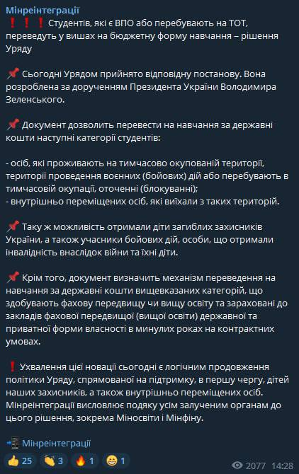 В Минреинтеграции рассказали, кого из студентов переведут на бюджетную форму обучения в университетах. Фото: report.if.ua