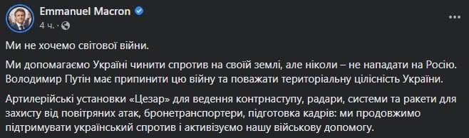 Также недавно Макрон пообещал передать Украине шесть гаубиц Caesar и зенитные ракеты.