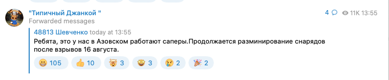 Действительно, в местных пабликах люди пишут, что слышали взрыв, но там же там появились и сообщения, что якобы это результат работы саперов, которые разминируют снаряды в соседнем Азовском после взрывов 16 августа.