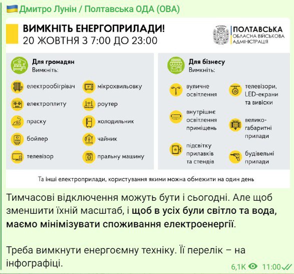 Губернатор Полтавской области предупредил жителей о возможных веерных отключениях