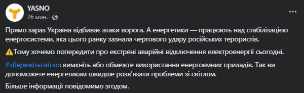 Также в ДТЭК предупреждает об аварийных отключениях из-за утреннего ракетного удара.