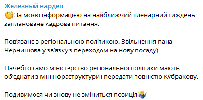 О ком речь - не сообщается. По словам Железняка, деятельность увольняемого министра связана с региональной политикой.