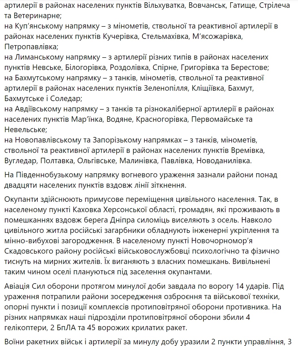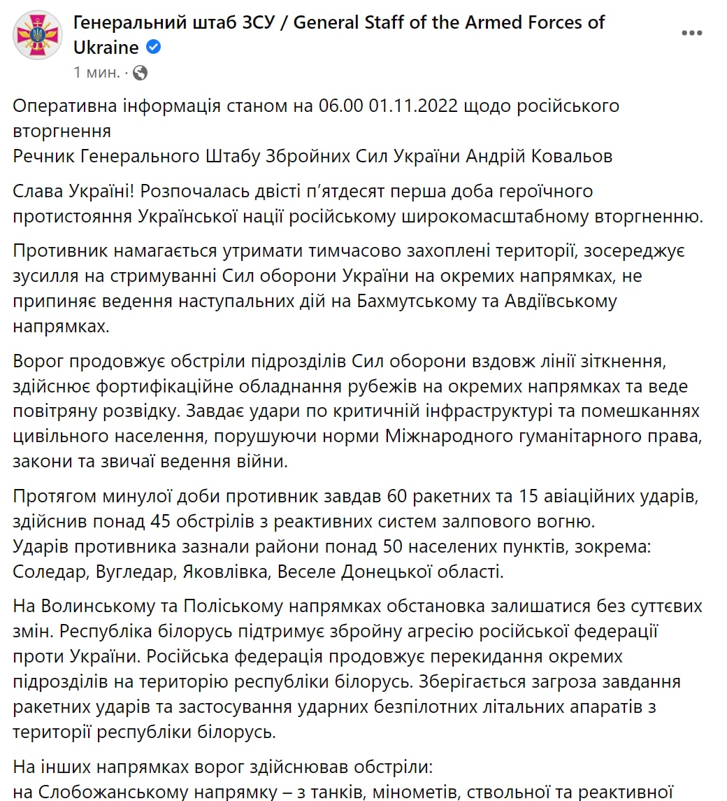 1. За прошедшие сутки противник нанес 60 ракетных и 15 авиационных ударов. 45 крылатых ракет сбито.