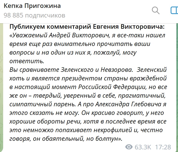 На вопрос российского журналиста "Кто опаснее сегодня: Зеленский или Невзоров?" Пригожин дал такой ответ: