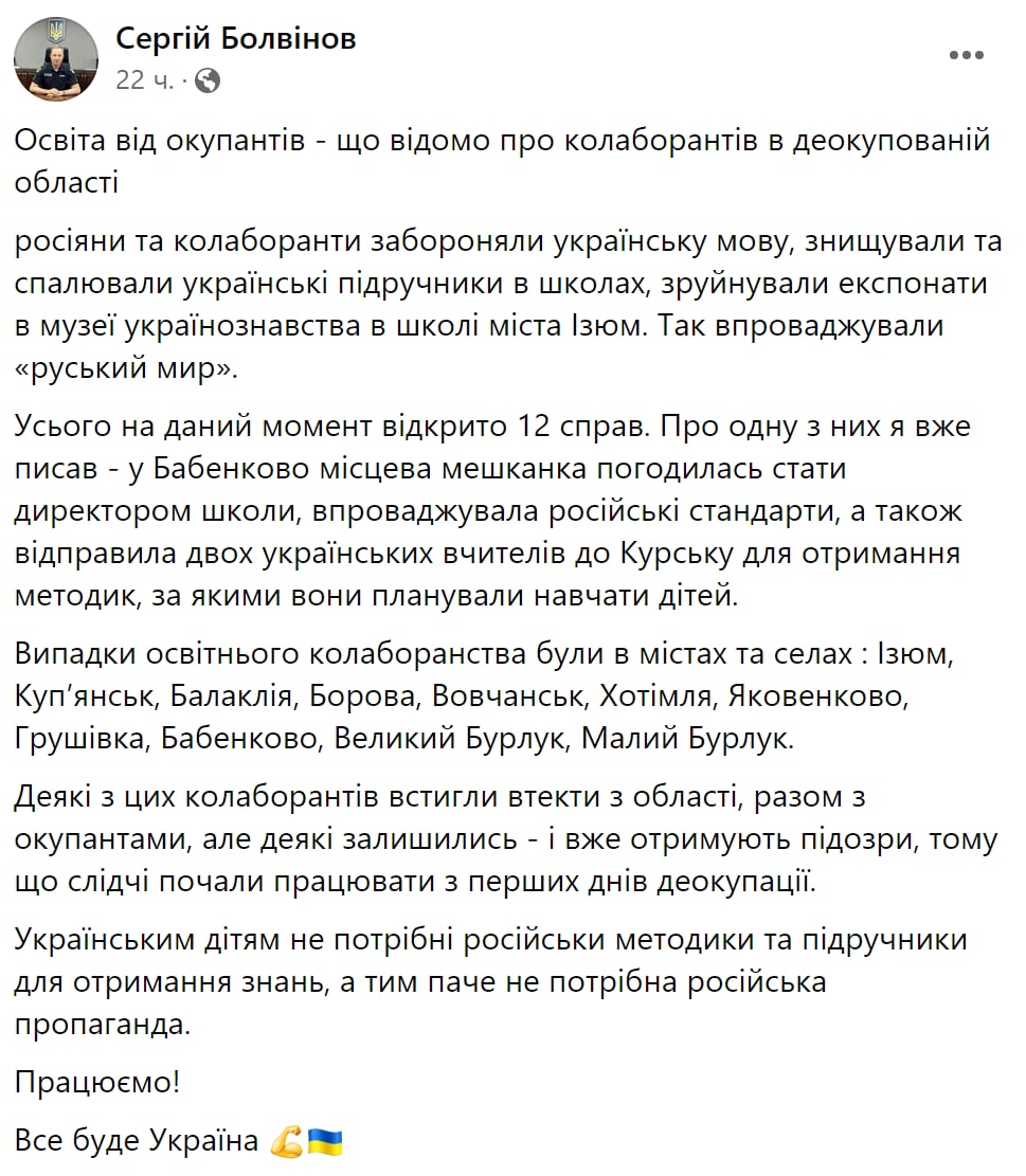 По его словам, случаи "образовательного коллаборантства" зафиксированы в таких населенных пунктах: Изюм, Купянск, Балаклея, Боровая, Волчанск, Хотомля, Яковенково, Грушевка, Бабенково, Большой Бурлук, Малый Бурлук.