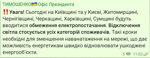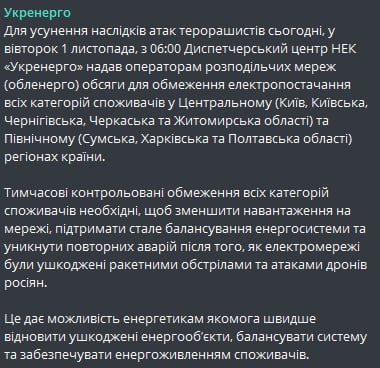 9:18 С 6 утра "Укрэнерго" предоставил облэнерго объемы для ограничения электроснабжения всех категорий потребителей в Центральном и Северном регионе для стабилизации напряжения.