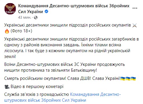 Командование Десантно-штурмовых войск ВСУ заявляет об уничтожении целого подразделения российских войск.
