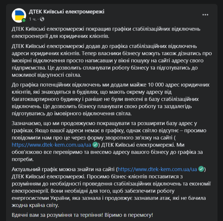 Оператор системы распределения "ДТЭК Киевские электросети" добавил в график стабилизационных отключений почти 10 тысяч адресов юридических клиентов.