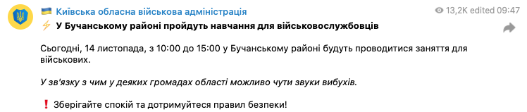 Жителей Киевской области предупредили, что сегодня днем они могут слышать взрывы - это обучение военнослужащих, которые будут проходить в Бучанском районе с 10:00 до 15:00.