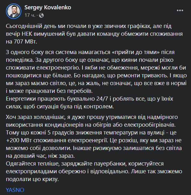 "Если у нас сейчас есть свет, это, к сожалению, не означает, что все уже в норме и может работать без перебоев... Я очень прошу воздержаться от чрезмерного использования кондиционеров на обогрев или электрообогревателей. Потому что каждые 5 градусов понижения температуры на улице – это +200 МВт потребления электроэнергии. Это роскошь, которую мы сейчас не можем себе позволить. Иначе рискуем оставаться без света на более длительное время", – просит гендиректор YASNO.