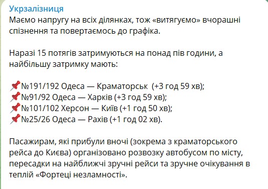 Напомним, накануне во время массированного ракетного удара задерживались два состава, позже УЗ сообщила о еще трех  поездах, которые опаздывали.