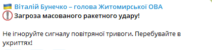 Глава Житомирской ОВА Виталий Бунечко пишет об угрозе массированного ракетного удара.
