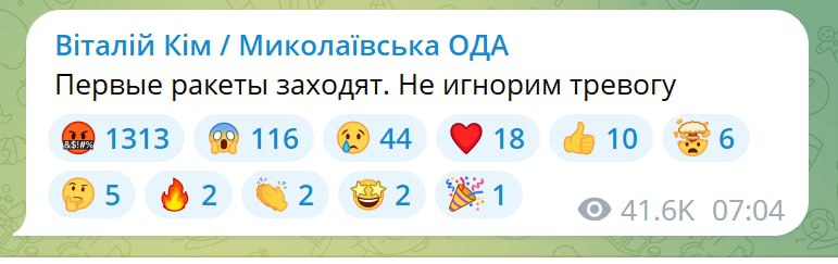 Губернатор Николаевской области Виталий Ким заявили о заходе ракет на территорию Украины. По его словам, ракеты уже вошли в воздушное пространство Украины на севере. Ожидается около 60 ракет.
