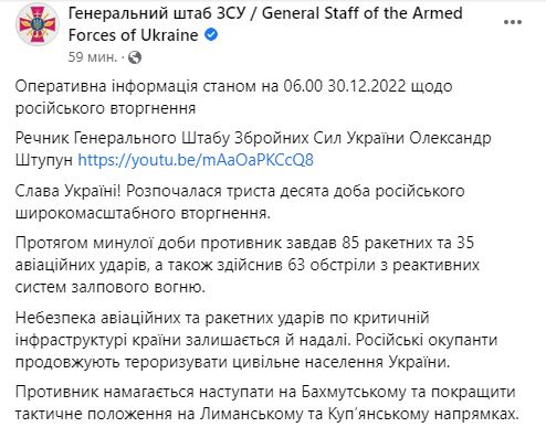 В пятницу, 30 декабря, Генштаб ВСУ обнародовал сводку о ситуации на фронте.