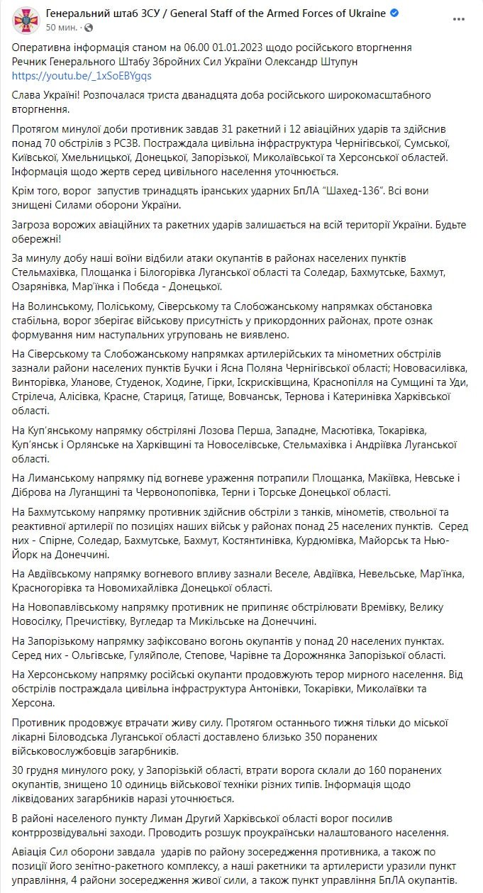 В первый день нового года начались 312-е сутки войны. Генштаб опубликовал оперативную информацию о российском вторжении по состоянию на 6 утра 1 января.
