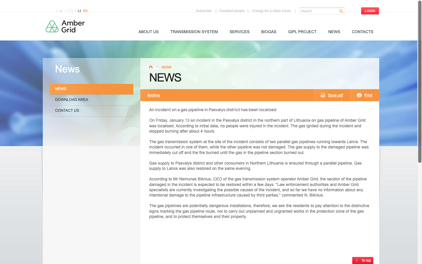 Известно, что газопровод используется для подачи газа в северную часть Литвы и для транспортировки газа в Латвию. Компания Amber Grid, которая обслуживает газопровод, в срочном порядке проинформировала правительство о сложившейся ситуации.