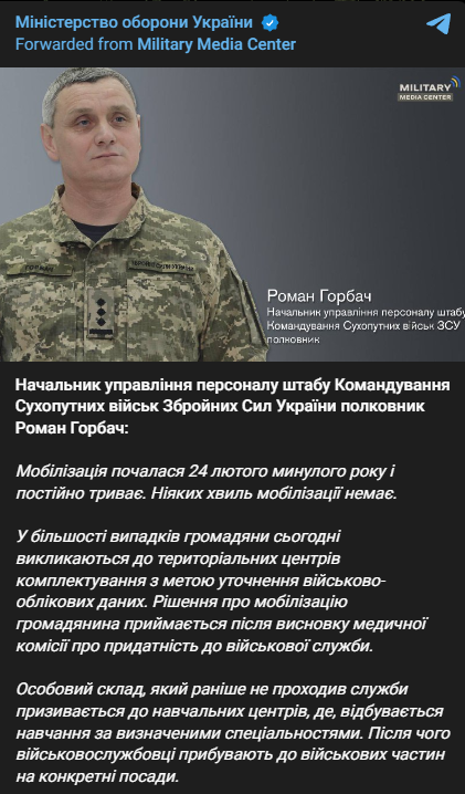 Горбач объяснил, что в первую очередь мобилизуют личный состав по определенным учетно-военным специальностям. По его словам, личный состав, ранее не проходивший службу, может быть призван только в учебные центры, где их будут учить по определенным специальностям. Только после этого они прибывают в воинскую часть.