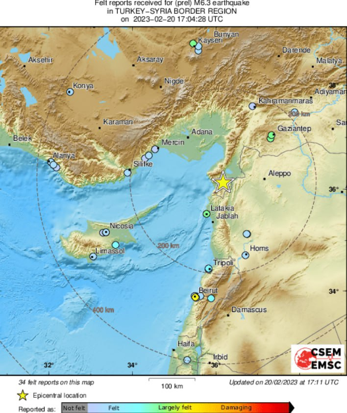 Новое землетрясение магнитудой 6,3 произошло на границе Турции и Сирии.