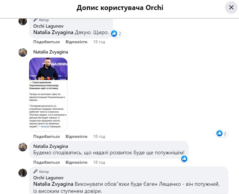 Об этом сообщил в комментарии под своим же постом в Фейсбуке член совета директоров УЗ Орест Лагунов.