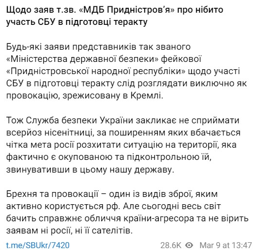 "Любые заявления представителей так называемого "Министерства государственной безопасности" фейковой "Приднестровской народной республики" по поводу участия СБУ в подготовке теракта следует рассматривать исключительно как провокацию, срежиссированную в Кремле.