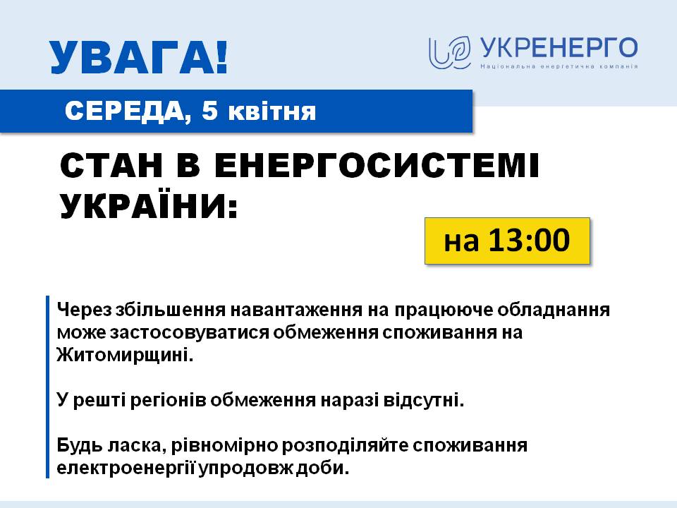 В среду, 5 апреля, в Житомирской области возможны отключения электроэнергии. Причина - увеличение нагрузки на оборудование, которое было повреждено в результате российских атак.
