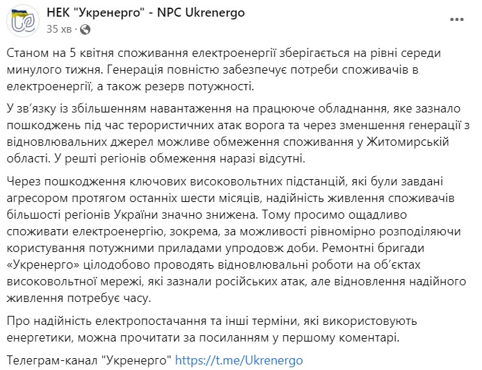 Об этом сообщает "Укрэнерго" в телеграм-канале.