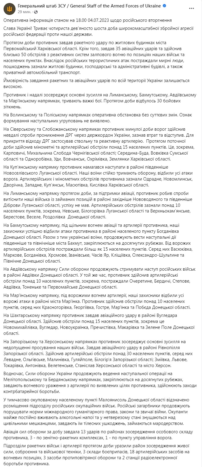 4. Армия РФ нанесла ракетный удар по Первомайскому Харьковской области, 35 авиаударов, совершила около 50 обстрелов из РСЗО.