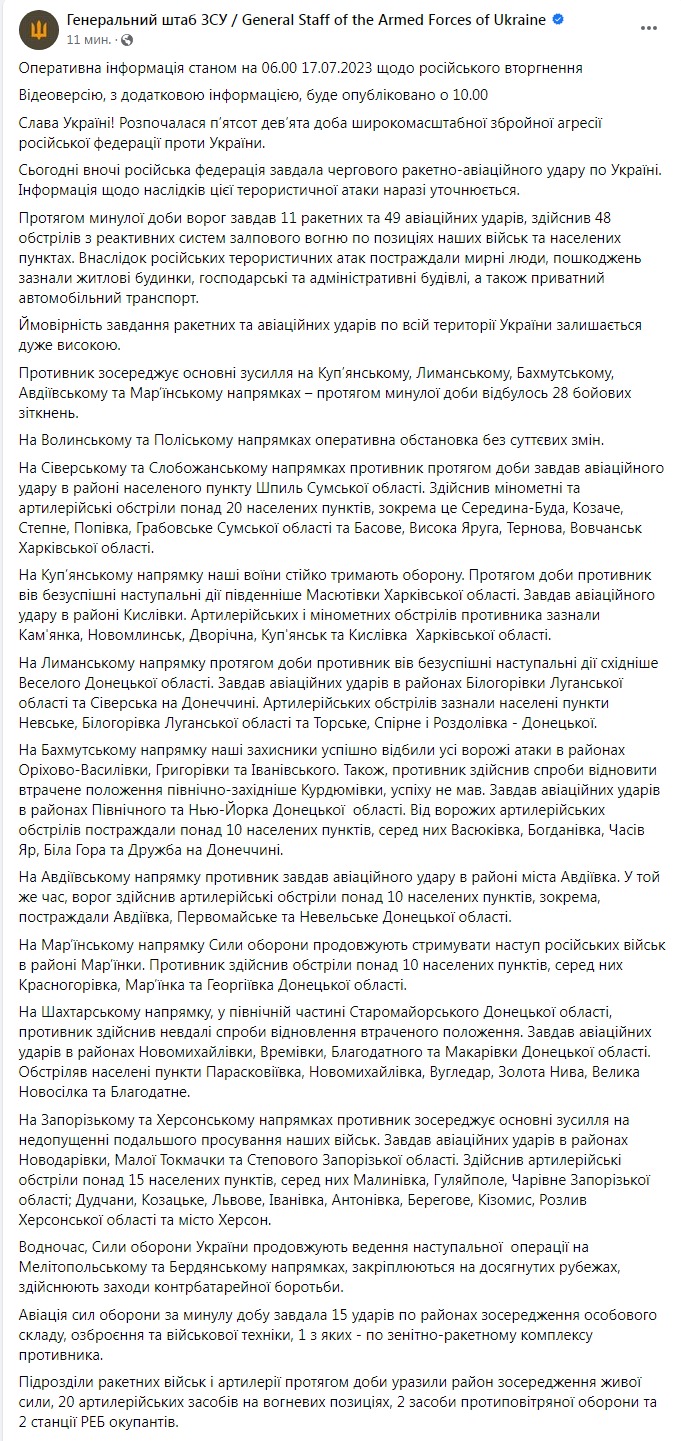 В понедельник, 17 июля, в Украине идет 509-й день войны с Россией.