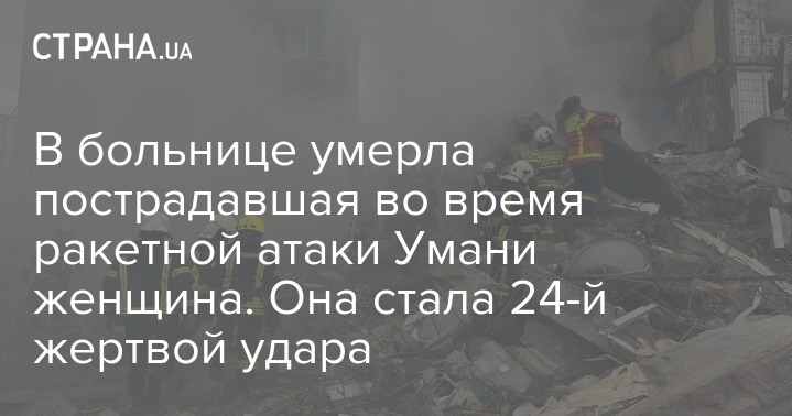 В больнице скончалась 26-летняя женщина, пострадавшая из-за ракетного удара по Умани в апреле 2023 года. Медики боролись за ее жизнь почти три месяца.