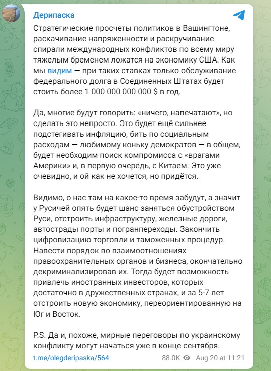 Один из богатейших российских олигархов Олег Дерипаска заявил, что мирные переговоры по поводу войны в Украине могут начаться уже в конце сентября. Свой прогноз он основывает на ухудшении финансовой ситуации в США.