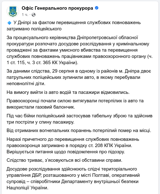 Патрульный полицейский, застреливший в Днепре мужчину, задержан "по факту превышения служебных полномочий".