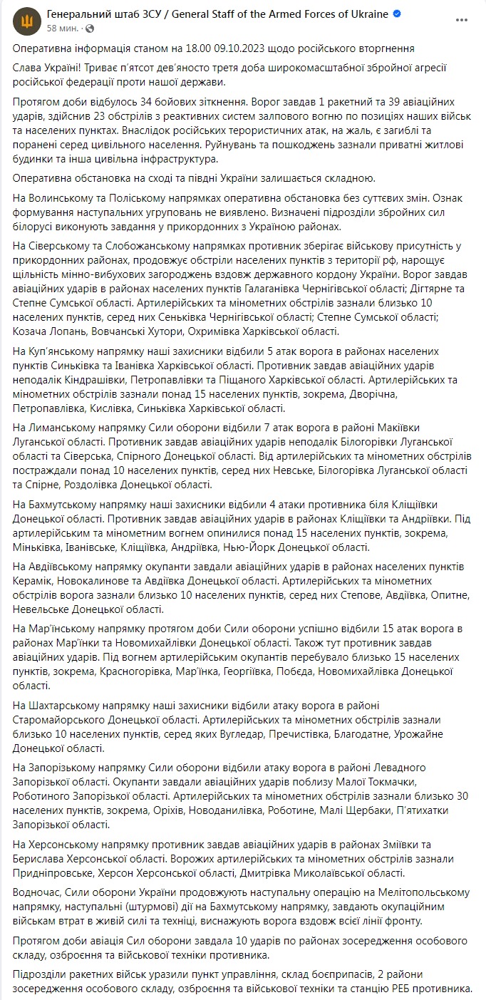 Генштаб ВСУ опубликовал оперативную информацию о ситуации на фронте по состоянию на 18:00 9 сентября.