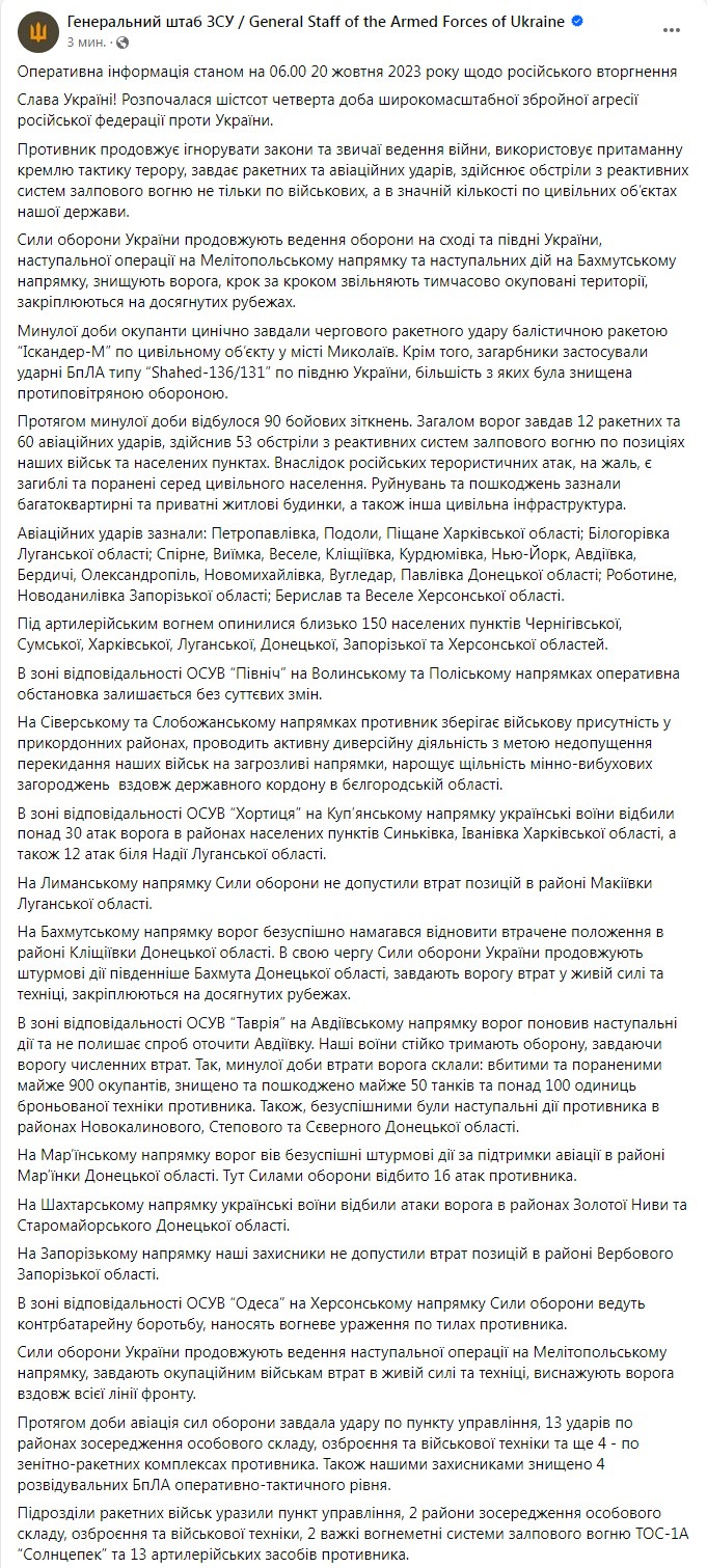 Генштаб ВСУ опубликовал оперативную информацию о ситуации на фронте по состоянию на 06:00 20 октября.