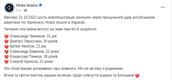 "Новая почта" обнародовала имена и возраст погибших под Харьковом сотрудников после вчерашнего ракетного удара по терминалу организации.