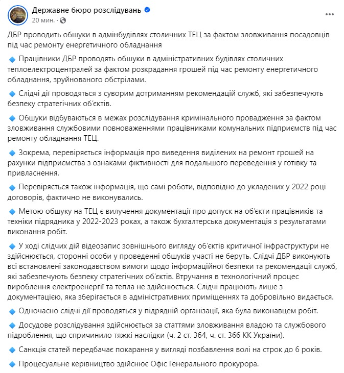 "Обыски проходят в рамках расследования уголовного производства по факту злоупотребления служебными полномочиями работниками коммунальных предприятий при ремонте оборудования ТЭЦ. В частности, проверяется информация о выводе выделенных на ремонт денег на счета предприятия с признаками фиктивности для последующего обналичивания и присвоения. Проверяется также информация, что сами работы, согласно заключенным в 2022 году договорам, фактически не выполнялись. Целью обыска на ТЭЦ является изъятие документации о допуске на объекты работников и техники подрядчика в 2022-2023 годах, а также бухгалтерская документация с результатами выполнения работ", - говорится в посте.