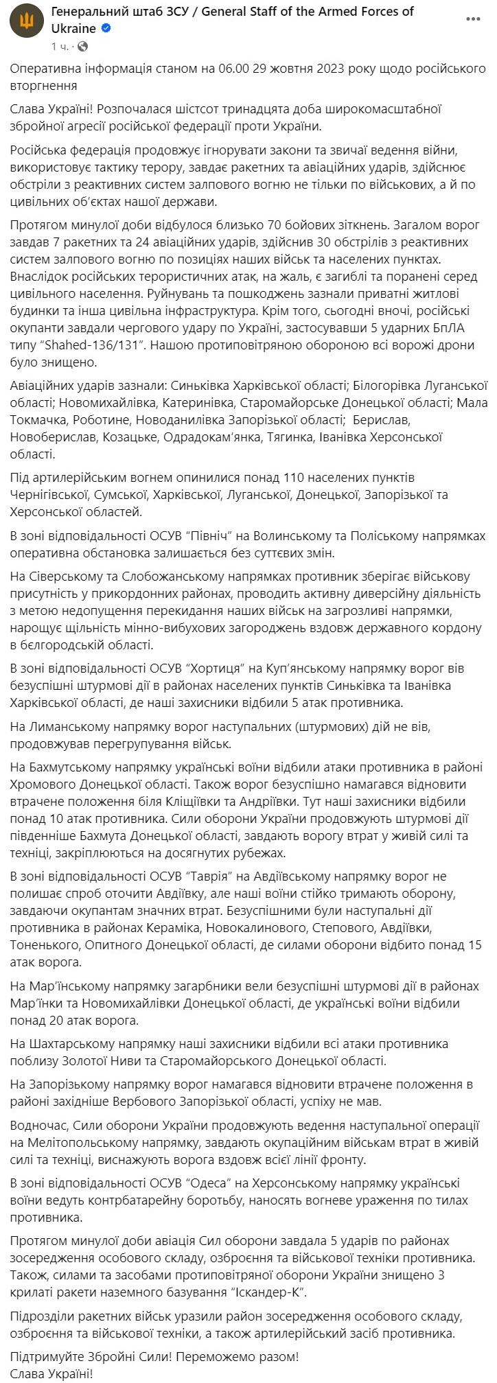 За прошедшие сутки произошло около 70 боевых столкновений. Всего РФ нанесла 7 ракетных и 24 авиационных ударов, совершила 30 обстрелов из реактивных систем залпового огня по позициям наших войск и населенным пунктам.
