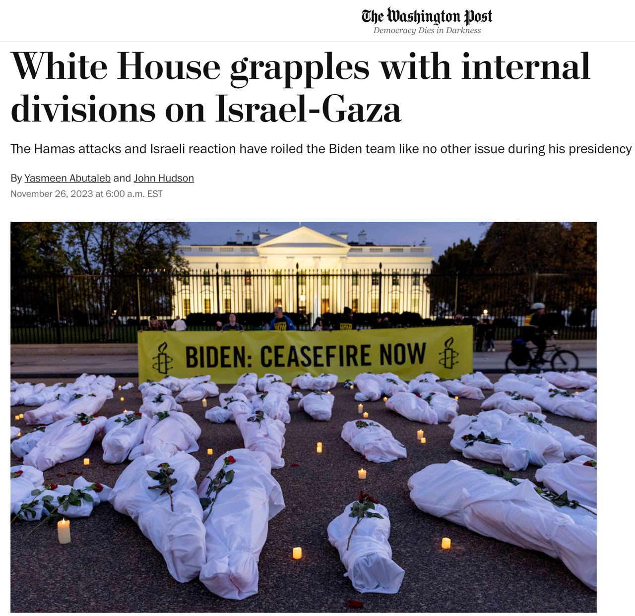 "Встреча официальных лиц подчеркивает, как действия Байдена в разрешении, возможно, крупнейшего внешнеполитического кризиса за время его президентства, разделяют Белый дом, который гордится тем, что проводит дисциплинированную и сплоченную операцию. По словам многочисленных помощников и союзников внутри и за пределами Белого дома, война между Израилем и сектором Газа взволновала администрацию больше, чем любой другой вопрос за первые три года пребывания Байдена у власти, поскольку его сотрудники мучаются из-за своей позиции по крайне эмоциональным вопросам", - пишет WP.