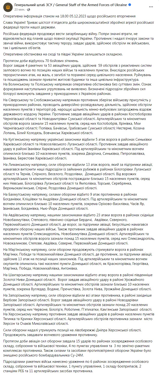 Генштаб дал оперативную информацию по состоянию на 18:00 5 декабря.