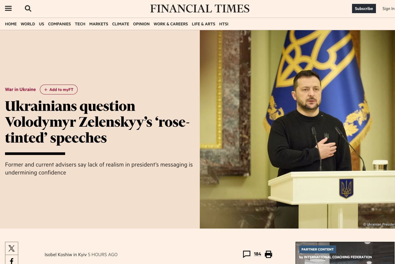 В Financial Times вышла статья с заголовком "Украинцы подвергают сомнению "розовые" речи Владимира Зеленского".