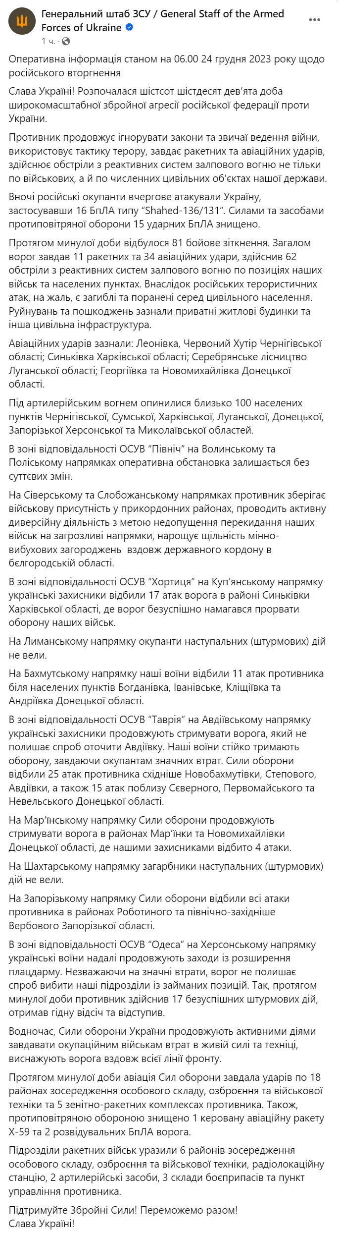 Война в Украине идет уже 669-й день. Мы следим за последними новостями и ключевыми событиями 24 декабря 2023 года в обновляемом онлайне.