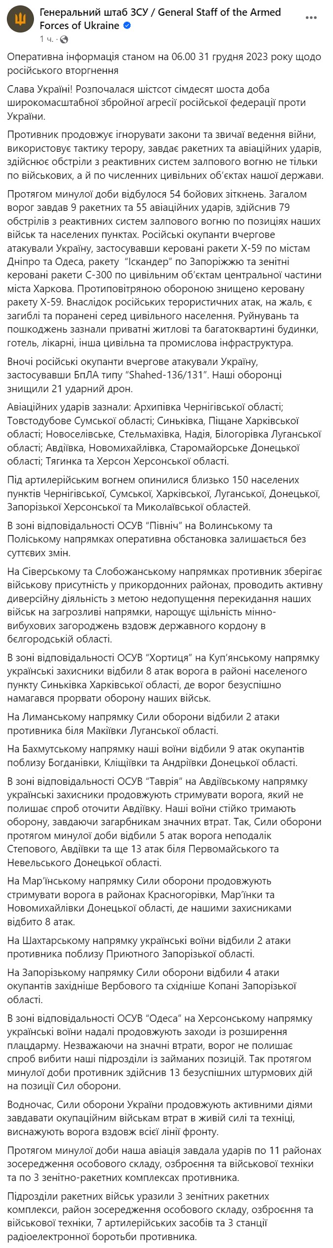 Война в Украине идет уже 676-й день. Мы следим за последними новостями и ключевыми событиями 31 декабря 2023 года в обновляемом онлайне.