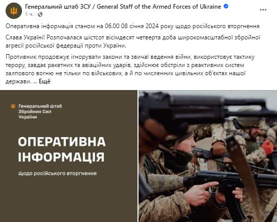 Утром 8 января Генштаб ВСУ обнародовал сводку о ситуации на фронте.
